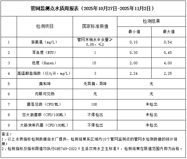 管網(wǎng)監(jiān)測(cè)點(diǎn)水質(zhì)周報(bào)表(2025年10月27日-2025年11月2日)