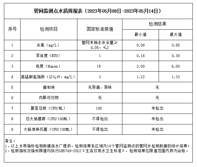 管網監測點水質周報表(2023年05月08日-2023年05月14日)
