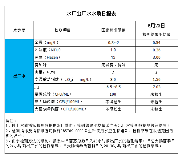 水廠出廠水水質(zhì)日?qǐng)?bào)表(2023-6-23)