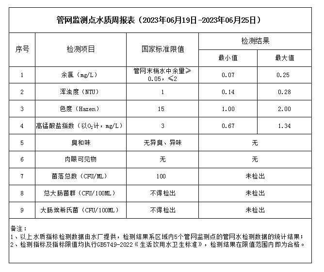 管網監測點水質周報表(2023年06月19日-2023年06月25日)
