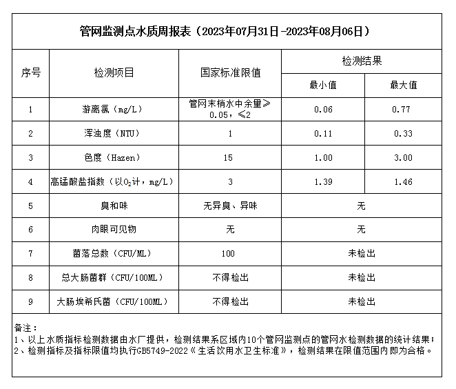 管網(wǎng)監(jiān)測點水質(zhì)周報表(2023年07月31日-2023年08月06日)