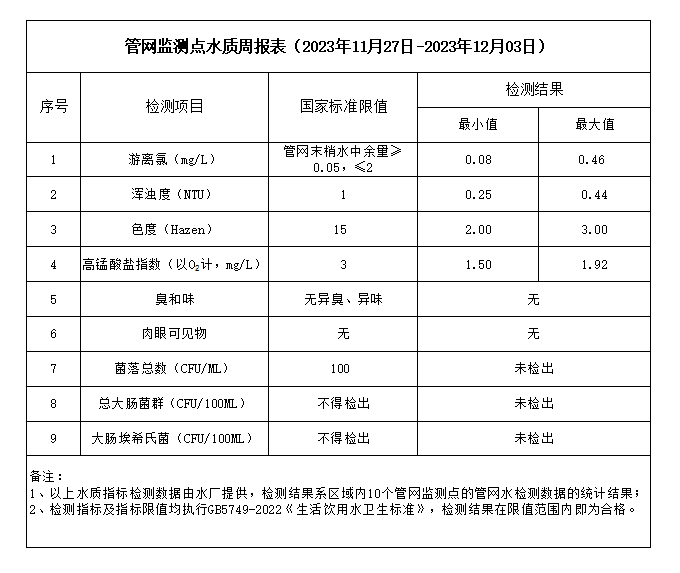 管網監測點水質周報表(2023年11月27日-2023年12月03日)