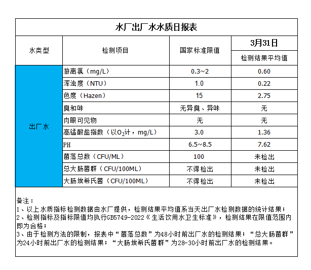 水廠出廠水水質日報表(2024-3-31)