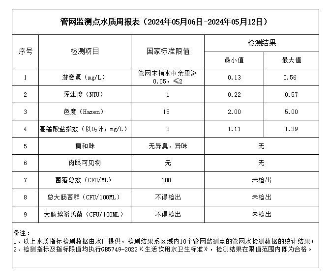 管網監測點水質周報表(2024年05月06日-2024年05月12日)