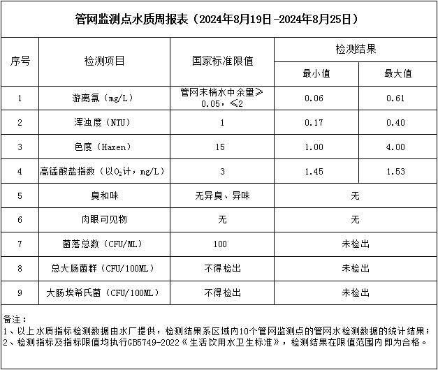 管網監測點水質周報表(2024年8月19日-8月25日)
