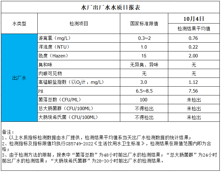 水廠出廠水水質(zhì)日?qǐng)?bào)表(2024-10-4)